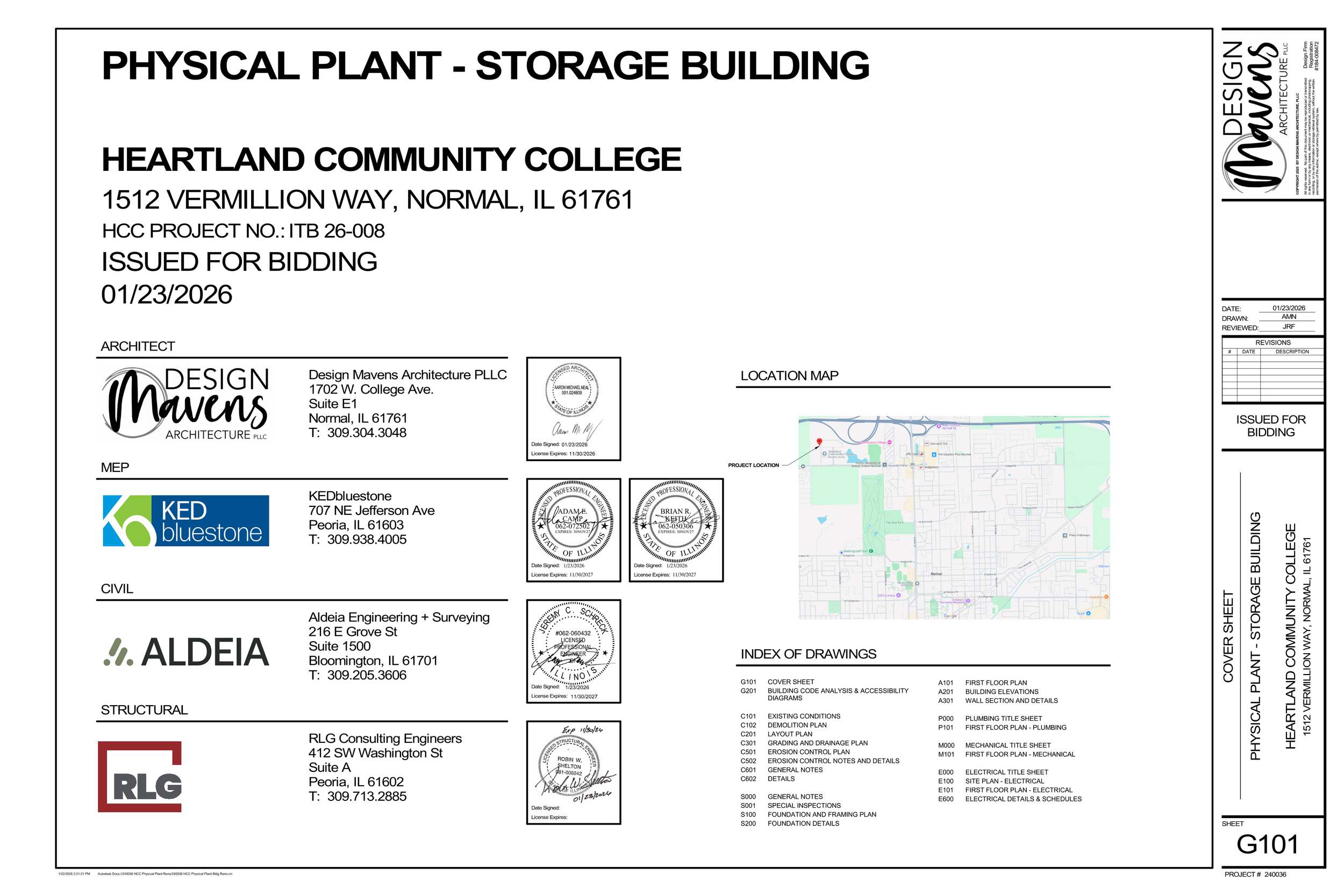 The scope includes a post-framed storage building clad with metal roof and wall panels and provided with mechanical, plumbing and electrical systems. The project will utilize shallow concrete foundations, sectional overhead doors with bollards, personnel door, and trench drains with oil interceptor. Also included are water service with hose bibbs and sill cocks, gas-fired unit heaters, as well as interior and exterior lighting with lighting controls and receptacles. Pavement work will be required to route sewer service connection and provide driveway for sectional overhead doors. Existing gas and electrical services between the existing physical plant building and the existing storage building shall be relocated, and the site shall be regraded and reseeded as required.